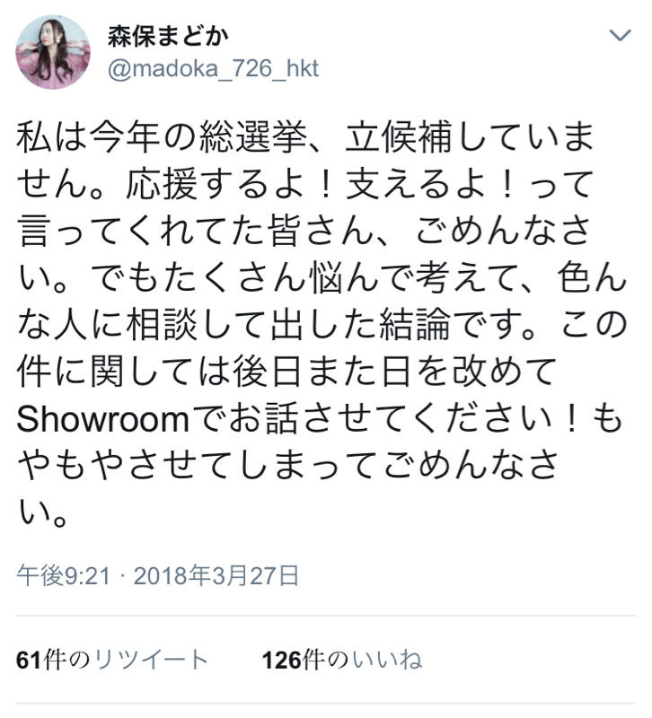 森保まどか、今年の総選挙に出ない事を発表。